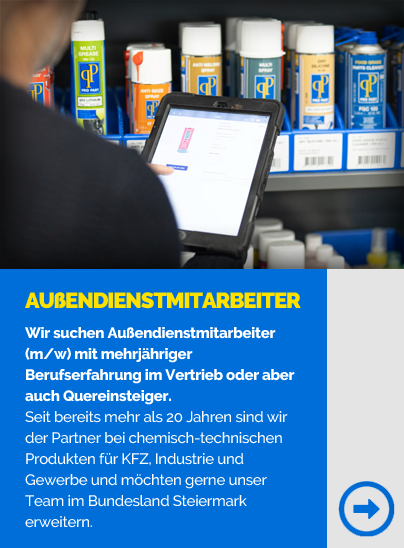 Seit bereits mehr als 20 Jahren sind wir der Partner bei chemisch-technischen Produkten für KFZ, Industrie und Gewerbe und möchten gerne unser Team im Bundesland Steiermark erweitern.